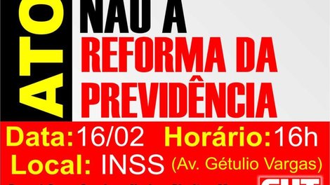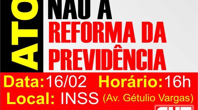 Cuiabá MT - A Central Única dos Trabalhadores de Mato Grosso (CUT MT) convoca toda a classe trabalhadora, principalmente os sindicatos cutistas, para participarem do Ato de Protesto contra a Reforma de Previdência Social proposta pelo governo Temer. A manifestação será realizada na quinta-feira, dia 16 de fevereiro, às 16 horas, em frente ao INSS, localizado na Avenida Getúlio Vargas.