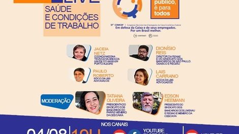 A terceira e última live preparatória para o 37º Congresso Nacional dos Empregados da Caixa Econômica Federal (Conecef) volta com o assunto fundamental para os empregados: saúde e condições de trabalho. Promovido pela Comissão Executiva dos Empregados da Caixa (CEE/Caixa) com apoio da Confederação Nacional dos Trabalhadores do Ramo Financeiro da CUT (Contraf-CUT) e Federação Nacional das Associações do Pessoal da Caixa Econômica Federal (Fenae), o debate acontece na quarta-feira (04), às 19h. A live será transmitida no Youtube e Facebook da Contraf-CUT e no Youtube da Fenae.
