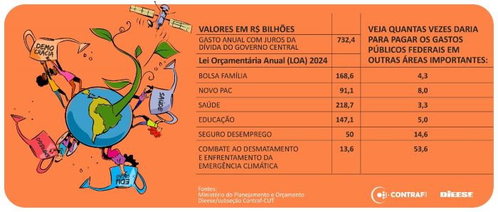 Só em 2023, a União pagou mais de R$ 732 bilhões com juros dos títulos. O valor equivale a 4,3 vezes os investimentos com o Bolsa Família, 8 vezes o montante direcionado para o novo Programa de Aceleração do Crescimento (PEC), voltado à recomposição e expansão da infraestrutura do país, além de 3,3 vezes o orçamento para a Saúde e 5 vezes o orçamento para a Educação. Veja tabela no final da matéria.