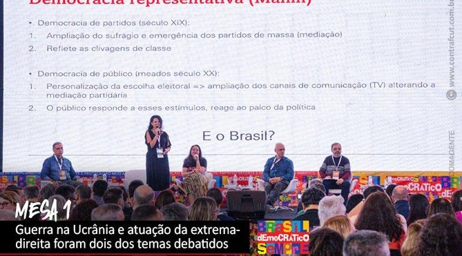 Na abertura dos trabalhos da 25ª Conferência Nacional d@s Trabalhador@s do Ramo Financeiro deste sábado (5), a primeira mesa tratou dos temas “Democracia” e “Conjunturas internacional e nacional”, apresentados, respectivamente, pela professora de Ciências Sociais Tathiana Chicarino e pelo professor de Política Internacional Moisés Marques, diretor acadêmico da Faculdade 28 de Agosto.