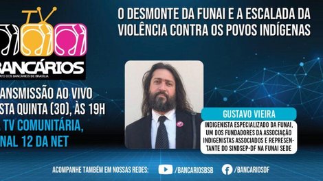 O TV Bancários desta quinta-feira (30) discute o desmonte da Fundação Nacional do Índio (Funai) e a escalada da violência contra os povos indígenas, em transmissão ao vivo, a partir das 19h, pela TV Comunitária de Brasília (canal 12 da Net) e pelas redes sociais do Sindicato.