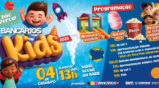 O Bancários Kids está chegando para garantir muita alegria, música, brincadeiras e aquele clima de festa que a criançada adora para comemorar o seu dia. No dia 4 de outubro, no salão social da AABB, a partir das 13h, filhos e filhas de sindicalizados terão à disposição uma programação especial com jogos, atividades recreativas, espaços de diversão com monitores, oficinas criativas, brinquedos infláveis, apresentações culturais e muito mais.