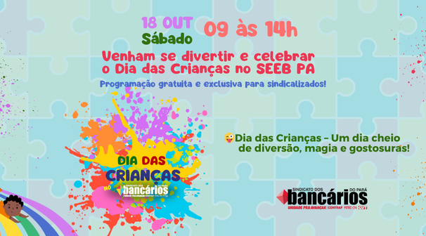 O Sindicato dos Bancários do Pará preparou uma programação especial para celebrar o Dia das Crianças com muita alegria e encanto! Será no dia 18 de outubro (sábado), das 9h às 14h, na sede do Sindicato — Rua 28 de Setembro, 1210, Reduto.