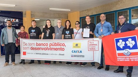 Os diretores fizeram uma visita ao centro administrativo do banco, em Campo Grande, e entregaram um material informativo sobre o desrespeito da direção da Caixa com os trabalhadores, além de dialogar com os bancários sobre os últimos ataques ao banco.