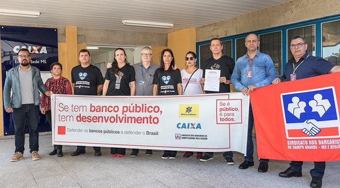 Campo Grande MS - Nesta quarta-feira, dia 6, o Sindicato dos Bancários de Campo Grande-MS e Região se mobilizou em mais um Dia Nacional de Luta a favor da Caixa Econômica Federal e de seus empregados. O ato é também para sensibilizar os trabalhadores para a greve geral do dia 14 de junho.