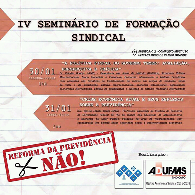 A ADUFMS (Sindicato dos Professores das Universidades Federais/MS) está promovendo, nos dias 30 e 31 de janeiro, o IV Seminário de Formação Sindical. Nesta edição, o debate tem como foco a política fiscal do governo Federal e seus reflexos, inclusive, na Previdência Social.