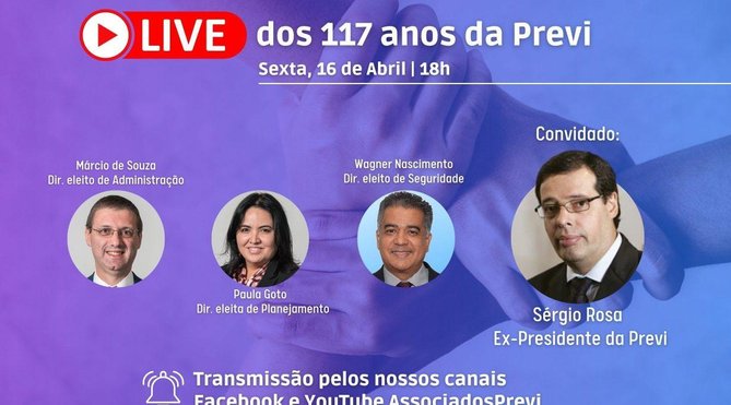 Os diretores eleitos fazem nesta sexta-feira 16, às 18h00, uma Live especial para comemorar o 117º aniversário da Previ e conversar com os associados sobre os últimos acontecimentos, como o resultado dos planos, a implantação do novo regulamento do Plano 1, o convênio com o INSS e suspensão do Empréstimo Simples. Terá transmissão ao vivo nos canais dos Associados Previ no Facebook e no Youtube. Clique aqui para participar.