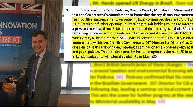 Um documento oficial da chancelaria britânica, obtido pelo Greenpeace e publicado em primeira mão pelo 247, revela como o governo de Michel Temer, que assumiu o poder após o golpe de 2016, trai interesses nacionais e atua em benefício de multinacionais do petróleo. Nele, o ministro de Comércio Greg Hands relata como o secretário-executivo do Ministério de Minas e Energia, Paulo Pedrosa, estaria fazendo lobby no governo brasileiro para servir à Shell, que teve todos os seus pedidos atendidos: menos impostos, menos conteúdo nacional e menos exigências ambientais.