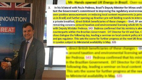 Um documento oficial da chancelaria britânica, obtido pelo Greenpeace e publicado em primeira mão pelo 247, revela como o governo de Michel Temer, que assumiu o poder após o golpe de 2016, trai interesses nacionais e atua em benefício de multinacionais do petróleo. Nele, o ministro de Comércio Greg Hands relata como o secretário-executivo do Ministério de Minas e Energia, Paulo Pedrosa, estaria fazendo lobby no governo brasileiro para servir à Shell, que teve todos os seus pedidos atendidos: menos impostos, menos conteúdo nacional e menos exigências ambientais.