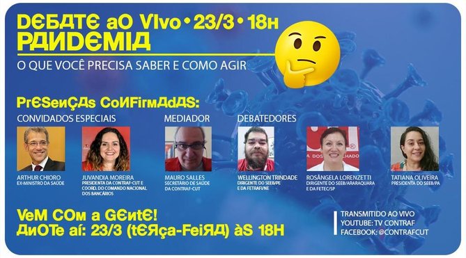 Você tem dúvidas sobre o assunto? Mande suas perguntas para os convidados pelo Instagram da Contraf-CUT ou pelo e-mail mailto:imprensa@contrafcut.org.br.