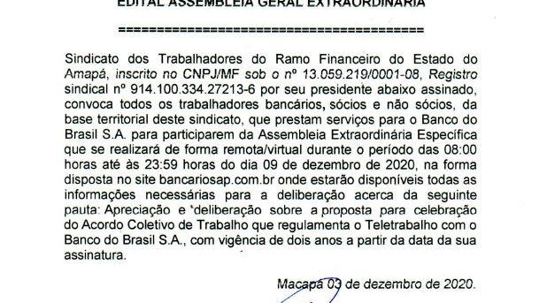 A Assembleia estará aberta dia 09 de dezembro (quarta-feira), no período de 8h às 23h59, e poderá ser acessada pelo link bancarios.votabem.com.br