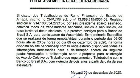 A Assembleia estará aberta dia 09 de dezembro (quarta-feira), no período de 8h às 23h59, e poderá ser acessada pelo link bancarios.votabem.com.br