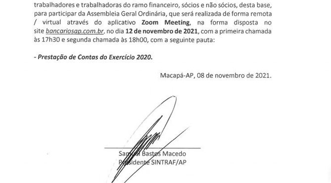 O Sindicato dos Trabalhadores do Ramo Financeiro do Estado do Amapá – SINTRAF/AP, convoca todos os trabalhadores e trabalhadoras do ramo financeiro, sócios e não sócios, desta base, para participar da Assembleia Geral Ordinária, que será realizada de forma virtual em link a ser disponibilizado no dia da votação no site bancariosap.com.br, no dia 12 de novembro de 2021, com a seguinte pauta: