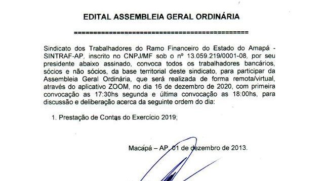 O Sindicato dos Trabalhadores do Ramo Financeiro do Estado do Amapá – SINTRAF/AP, convida todos os bancários e bancárias, sócios e não sócios, desta base, para participar da Assembleia Geral Ordinária, que será realizada de forma remota/virtual através do aplicativo Zoom, no dia 16 de dezembro de 2020, com primeira chamada as 17:30h e segunda chamada as 18:00h, com a seguinte pauta: