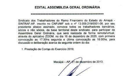 O Sindicato dos Trabalhadores do Ramo Financeiro do Estado do Amapá – SINTRAF/AP, convida todos os bancários e bancárias, sócios e não sócios, desta base, para participar da Assembleia Geral Ordinária, que será realizada de forma remota/virtual através do aplicativo Zoom, no dia 16 de dezembro de 2020, com primeira chamada as 17:30h e segunda chamada as 18:00h, com a seguinte pauta: