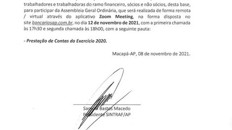 O Sindicato dos Trabalhadores do Ramo Financeiro do Estado do Amapá – SINTRAF/AP, convoca todos os trabalhadores e trabalhadoras do ramo financeiro, sócios e não sócios, desta base, para participar da Assembleia Geral Ordinária, que será realizada de forma virtual em link a ser disponibilizado no dia da votação no site bancariosap.com.br, no dia 12 de novembro de 2021, com a seguinte pauta: