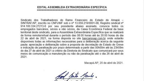 O SINTRAF/AP convoca todos os empregados bancários, sócios e não sócios, da Caixa Econômica Federal da base territorial deste sindicato, para a Assembleia Extraordinária Específica que se realizará de forma remota/virtual durante o período das 8h às 20h do dia 22 de abril de 2021 com a seguinte pauta: – Apreciação e deliberação sobre a proposta de decretação de Estado de Greve e indicação de paralização por prazo determinado a partir das 00h00m até as 23h59m do dia 27 de abril de 2021.