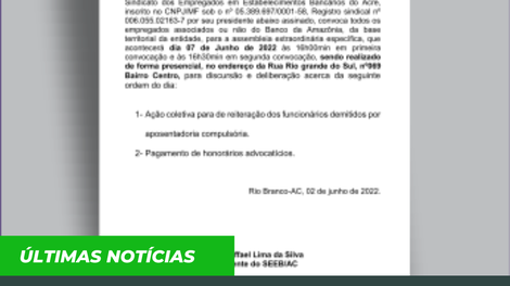 Sindicato dos Empregados em Estabelecimentos Bancários do Acre, inscrito no CNPJ/MF sob o nº 05.389.697/0001-58, Registro sindical nº 006.055.02163-7 por seu presidente abaixo assinado, convoca todos os empregados associados ou não do Banco da Amazônia, da base territorial da entidade, para a assembleia extraordinária específica, que acontecerá dia 07 de Junho de 2022 às 16h00min em primeira convocação e às 16h30min em segunda convocação, sendo realizado de forma presencial, no endereço da Rua Rio grande do Sul, nº069 Bairro Centro, para discursão e deliberação acerca da seguinte ordem do dia:
