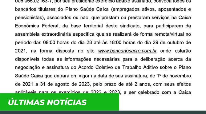 O Sindicato dos Empregados em Estabelecimentos Bancários do Estado do Acre, inscrito no CNPJ/MF sob o n.º 05.389.697/0001-58, registro sindical n.º 006.055.02163-7, por seu presidente exercício abaixo assinado, convoca todos os bancários titulares do Plano Saúde Caixa (empregados ativos, aposentados e pensionistas), associados ou não, que prestam ou prestaram serviços na Caixa Econômica Federal, da base territorial deste sindicato, para participarem da assembleia extraordinária específica que se realizará de forma remota/virtual no período das 08:00 horas do dia 28 até às 18:00 horas do dia 29 de outubro de 2021, na forma disposta no site www.bancariosacre.com.br onde estarão disponíveis todas as informações necessárias para a deliberação acerca da negociação e assinatura do Acordo Coletivo de Trabalho Aditivo sobre o Plano Saúde Caixa que entrará em vigor na data de sua assinatura, de 1º de novembro de 2021 a 31 de agosto de 2023, pelo prazo de até 2 anos, com seus efeitos aplicáveis para os exercícios de 2022 e 2023, a ser celebrado com a Caixa Econômica Federal.