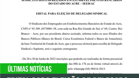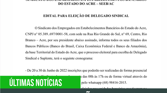 O Sindicato dos Empregados em Estabelecimentos Bancários do Estado do Acre, CNPJ n° 05.389..697/0001-58, com sede na Rua Rio Grande do Sul, n° 69, Centro, Rio Branco – Acre, por seu presidente abaixo assinado, informa todos os seus filiados dos Bancos Públicos (Banco do Brasil, Caixa Econômica Federal e Banco da Amazônia), da base Territorial do Estado do Acre, que o processo eleitoral para escolha de Delegado Sindical e Suplente, terá o seguinte cronograma: