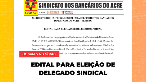 O Sindicato dos Empregados em Estabelecimentos Bancários do Estado do Acre, CNPJ n° 05.389..697/0001-58, com sede na Rua Rio Grande do Sul, n° 69, Centro, Rio Branco – Acre, por seu presidente abaixo assinado, informa todos os seus filiados dos Bancos Públicos (Banco do Brasil, Caixa Econômica Federal e Banco da Amazônia), da base Territorial do Estado do Acre, que o processo eleitoral para escolha de Delegado Sindical e Suplente, terá o seguinte cronograma: