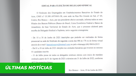 O Sindicato dos Empregados em Estabelecimentos Bancários do Estado do Acre, CNPJ n° 05.389..697/0001-58, com sede na Rua Rio Grande do Sul, n° 69, Centro, Rio Branco – Acre, por seu presidente abaixo assinado, informa todos os seus filiados dos Bancos Públicos (Banco do Brasil, Caixa Econômica Federal e Banco da Amazônia), da base Territorial do Estado do Acre, que o processo eleitoral para escolha de Delegado Sindical e Suplente, terá o seguinte cronograma: