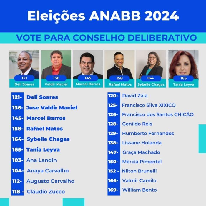 A Federação dos Empregados em Estabelecimentos Bancários do Centro-Norte (Fetec-CUT/CN) considera importante votar em candidatos comprometidos com essas lutas e por isso estão apoiando uma lista de candidatos que representam várias correntes e regiões do país, que têm Compromisso com os Associados e buscam a Unidade por uma Anabb mais Forte. E pede o voto BB para eles. A lista é a seguinte: