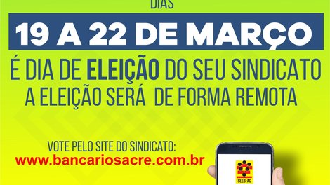 Entre os dias 19 e 22 de março, os bancários e as bancárias do Acre elegerão sua nova Diretoria do Sindicato para o triênio 2021 – 2024. Devido ao alto índice de contágio por Covid-19 e, com o objetivo de resguardar a saúde de todos e todas, conforme decidido em assembleia todo o processo de votação se dará de forma virtual, pelo sistema de votação VOTABEM no link https://bancariosacre.votabem.com.br/