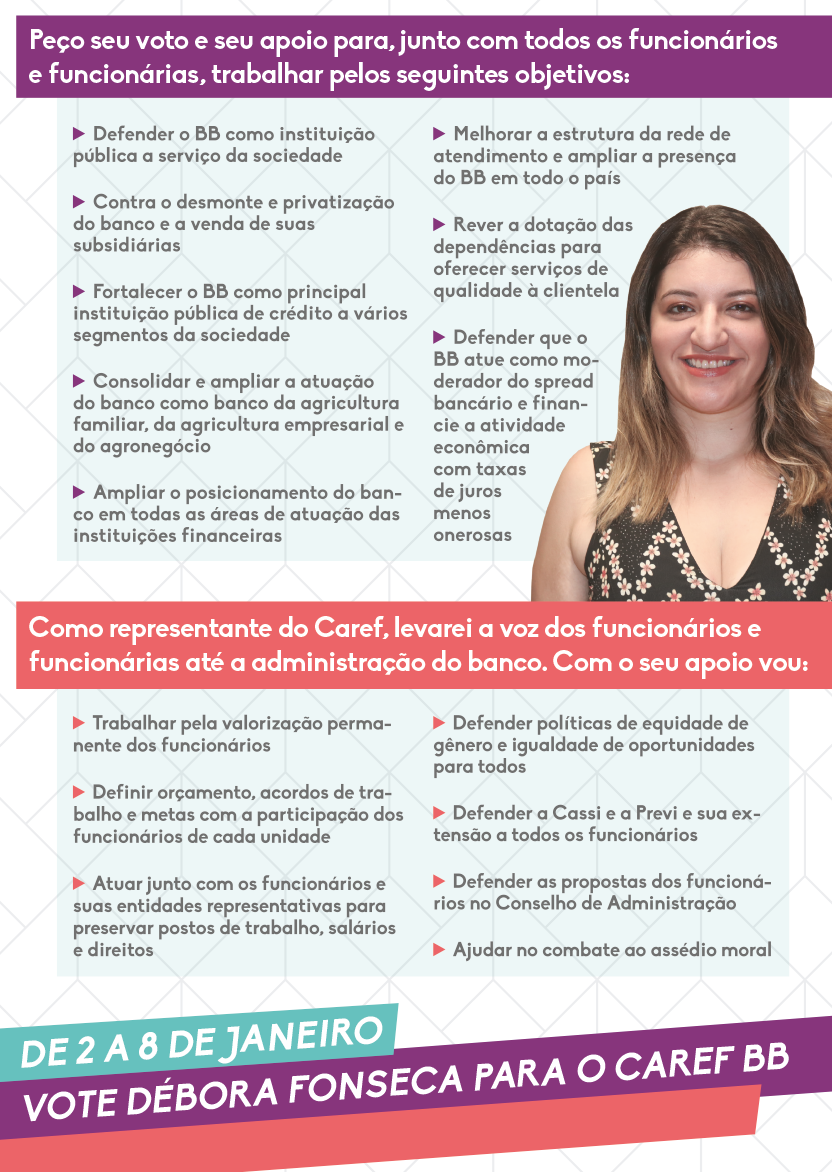 Os funcionários do Banco do Brasil vão às urnas entre 2 e 8 de janeiro para eleger seu representante ao Conselho de Administração do banco (Caref, ou Conselheiro de Administração Representante dos Funcionários). A Federação dos Bancários do Centro Norte (Fetec-CUT/CN), assim como a Contraf-CUT e a maioria dos sindicatos de todo o país, apoia Débora Fonseca para defender os interesses e propostas dos funcionários no órgão máximo de decisão do BB e lutar contra o desmonte e a privatização.
