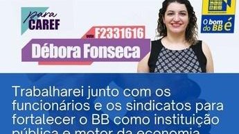 Débora Fonseca é também a voz dos funcionários e funcionárias no Conselho de Administração pela exigência de respeito da direção do banco aos que, de fato, constroem o Banco do Brasil no dia a dia, aqueles que conhecem a realidade da clientela nos mais diferentes pontos do país, do norte ao sul, no campo e nas cidades. A restrição imposta pela legislação em votos de pautas que envolvam questões funcionais não a impede de atuar no Caref em defesa da valorização dos trabalhadores, contra a retirada de direitos e conquistas, como tem feito.