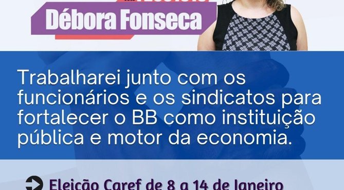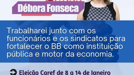Os funcionários do Banco do Brasil vão escolher entre esta sexta-feira 8 de janeiro e a quinta-feira 14, em primeiro turno, seu representante no Conselho de Administração do BB (Caref). A Federação dos Bancários do Centro-Norte (Fetec-CUT/CN) apoia à reeleição a candidata Débora Fonseca (F2331616), para dar continuidade ao trabalho de fortalecer a luta em defesa do BB público, a serviço do desenvolvimento econômico e social e como principal agente de crédito para atividades produtivas geradoras de emprego e renda.