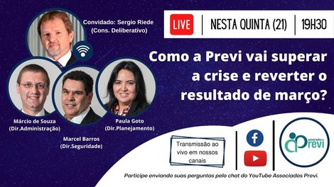 Os dirigentes eleitos da Previ realizam nesta quinta-feira 21, às 19h30, mais uma transmissão ao vivo no canal no Youtube/Associados Previ. Dentre outros assuntos, os eleitos vão debater com os associados a estratégia da Previ para reverter a crise e os resultados de março.