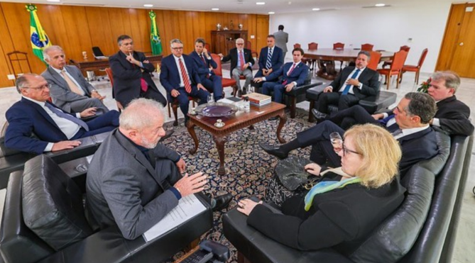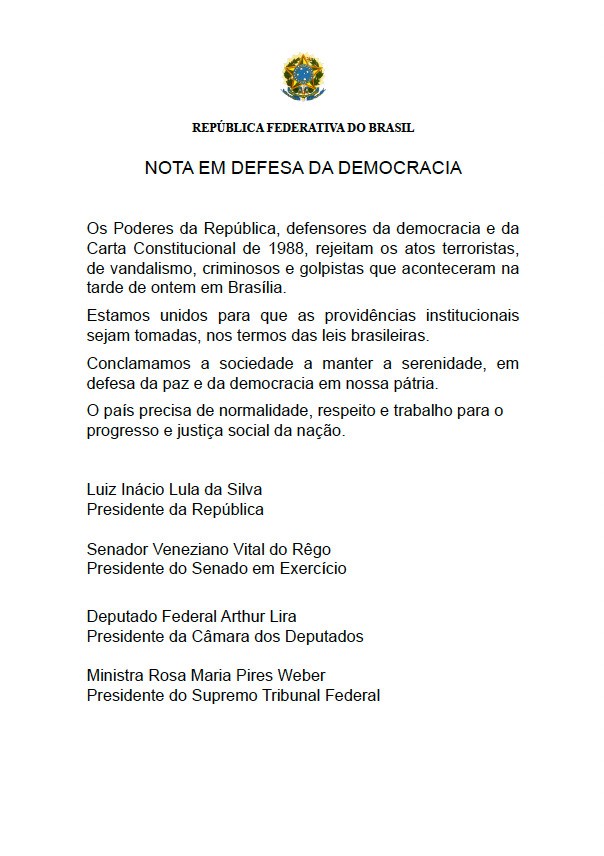 A nota é assinada por Lula, pela ministra Rosa Weber, presidenta do Supremo Tribunal Federal (STF), pelo senador Veneziano Vital do Rêgo (MDB-PB), presidente em exercício do Senado, e pelo deputado federal Arthur Lira (PP-AL), que preside a Câmara.