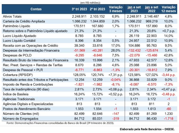 O BB afirma que o índice de inadimplência para atrasos superiores a 90 dias ficou em 2,81%, aumento de 0,47 ponto percentual (p.p.) em relação a setembro de 2022 e abaixo da inadimplência média do Sistema Financeiro Nacional (3,50%).
