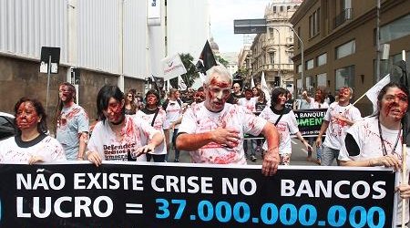 Bancários e bancárias fantasiados como zumbis tomaram as ruas de Porto Alegre nesta quarta, 14/10. A atividade buscou denunciar o ambiente de adoecimento a que a categoria está exposta e pediu o fim das metas abusivas, do excesso de jornada e mais contratações.