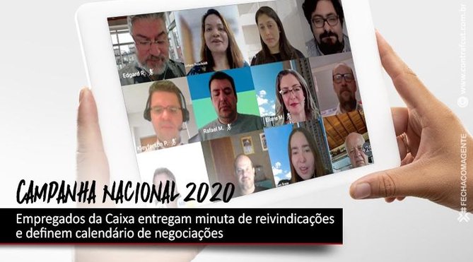 A primeira reunião de negociação da Campanha Nacional 2020 entre a Comissão Executiva dos Empregados da Caixa (CEE/Caixa) e o banco, realizada por videoconferência nesta sexta-feira (7), começou com oficialização da entrega da minuta de reivindicações para o Acordo Coletivo de Trabalho (ACT) dos empregados da Caixa.