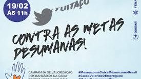 Empregados da Caixa Econômica Federal de todo o Brasil e entidades representativas dos empregados estarão mobilizados nesta sexta-feira (19) contra as metas desumanas impostas pelo banco que estão causando o adoecimento dos trabalhadores. Às 11h, começa o tuitaço e os bancários podem usar as hashtags #MexeucomaCaixaMexeucomoBrasil #CaixaValorizeOEmpregado e #MetasDesumanasNão nos seus perfis da rede social. O objetivo também é denunciar o desrespeito do banco contra os empregados e o déficit no quadro de trabalhadores.