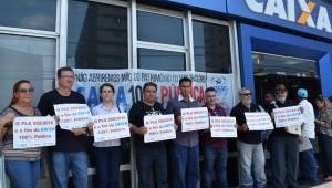 Os dirigentes do Sindicato de Campos (RJ) percorreram as agências da Caixa fixando cartazes de protesto contra o projeto de abertura do capital da empresa, além de dialogar com funcionários e clientes sobre esta grave ameaça que paira sobre empresas públicas e os empregos dos trabalhadores e trabalhadoras.