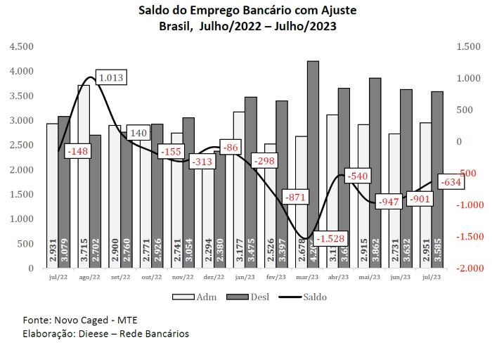 O setor bancário perdeu 634 postos de trabalho em julho, segundo Pesquisa do Emprego Bancário (PEB), realizada pelo Departamento Intersindical de Estatística e Estudos Socioeconômicos (Dieese), com base nos dados do Novo Caged (Cadastro Geral de Empregados e Desempregados). É o décimo mês consecutivo com redução do número de postos de trabalho. O último mês com aumento de postos foi em setembro de 2022. Desde então, nos dez meses seguintes, houve uma redução de 6.273 postos de trabalho na categoria bancária.