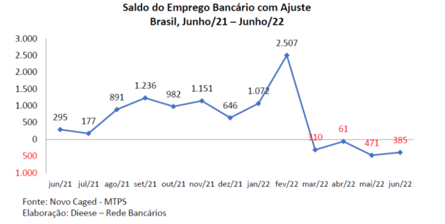 Pelo quarto mês consecutivo o emprego bancário encolheu. Entre março e junho de 2022, foram fechados 1.227 postos de trabalho no setor. Nos últimos 12 meses, porém, o saldo ainda é positivo em 7,4 mil postos, decorrente das contratações da Caixa Econômica Federal, por decisão judicial, de aprovados no concurso de 2014. No semestre, a variação teve saldo positivo em 2.352 mil vagas; e no mês de junho, negativo em 385.