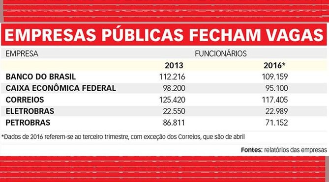 Desde 2013, segundo dados parciais, obtidos nos relatórios administrativos das próprias companhias, apenas quatro das maiores empresas – Banco do Brasil, Caixa Econômica Federal, ECT e Petrobras – fecharam 30 mil postos de trabalho. Com novos programas em curso ou por vir, esse total chega a aproximadamente 55 mil.