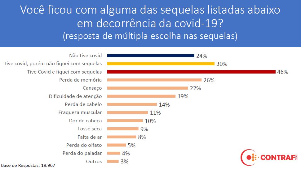 Entre os que apresentam sequelas, as principais são: perda de memória (26%); cansaço (22%); dificuldade de atenção (19%); perda de cabelo (14%); fraqueza muscular (11%) e dor de cabeça (10%).