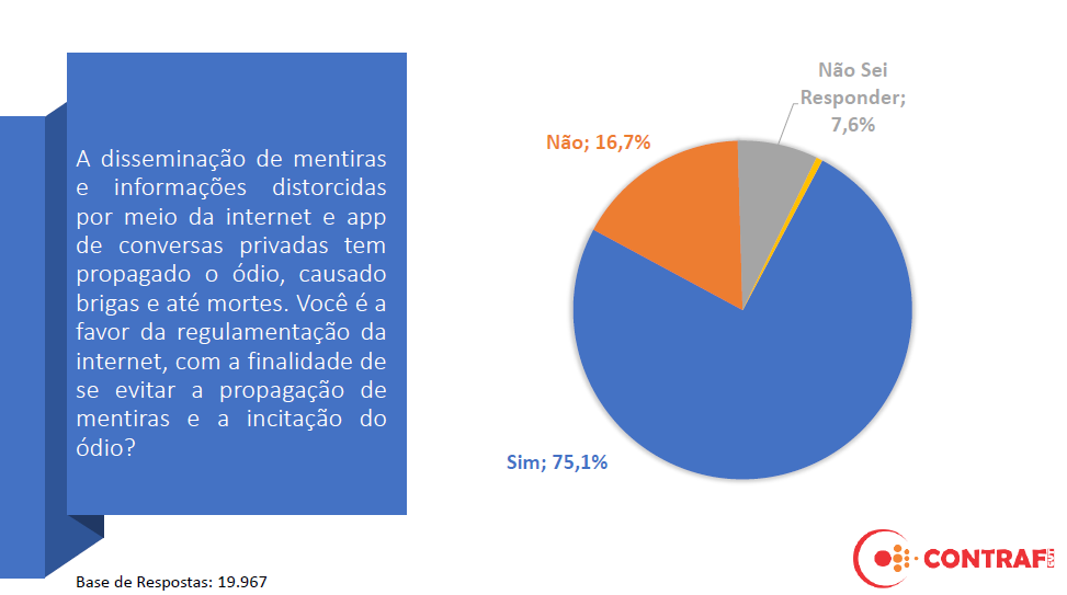 Para 75,1% dos bancários que responderam a consulta, deve existir no país regulação da internet para coibir a disseminação de mentiras e informações distorcidas por meio da internet e aplicativos de conversas privadas que propagam o ódio.