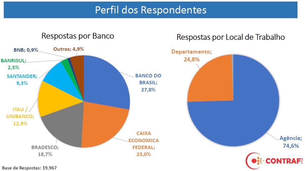 A maior parte dos consultados é dos cinco maiores bancos do país: 27,8% do Banco do Brasil; 23,0% da Caixa Econômica Federal; 18,7% do Bradesco; 12,9% do Itaú/Unibanco; e 9,3% do Santander.