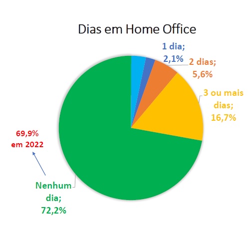 A pesquisa observou um leve recuo no volume de bancários em home office (teletrabalho). Na consulta anterior, 69,9% diziam não exercer trabalho remoto em nenhum dia da semana. Neste ano, o percentual aumentou para 72,2%.