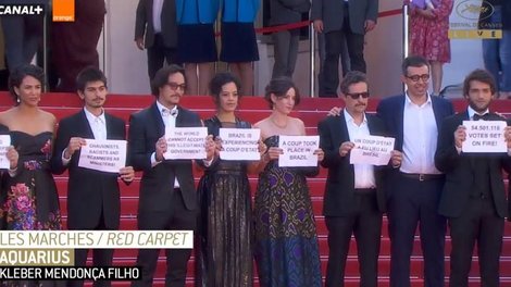 O evento, que ocorre todos os anos em maio, na França, é um dos mais prestigiados festivais de cinema do mundo. Os integrantes brasileiros, a caminho da sala de exibição, fizeram uma pausa e estenderam cartazes: "Misóginos, racistas e golpistas como ministros"; "Brasil está experienciando um golpe de estado"; "54.501.118 votos incendiados"; e "O mundo não pode aceitar este governo ilegítimo" acusavam, em referência ao mandato interino de Michel Temer (PMDB).