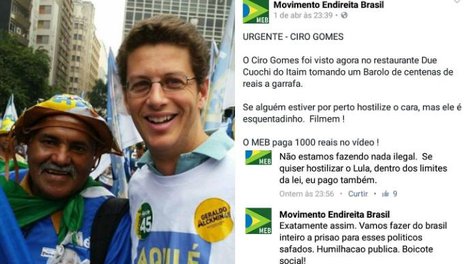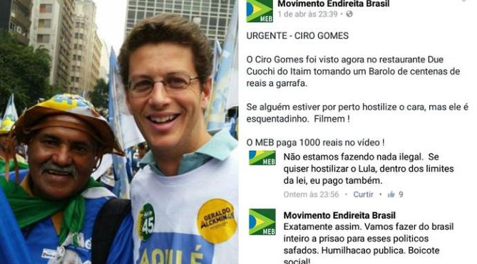 Agora, a bola da vez é Ciro Gomes. O movimento de ultradireita de Salles está oferecendo comprar vídeos de quem desacatar e gravar. Deu, no Facebook, a localização de Ciro Gomes, e ofereceu a recompensa por gravações de hostilizações que ele possa sofrer. Oferece muito mais caso Lula passe por isso dentro dos "limites" da lei.