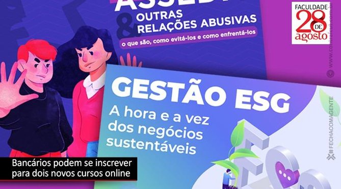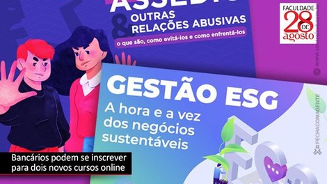 A Faculdade 28 de Agosto, em parceria com o Sindicato dos Bancários e Financiários de São Paulo, Osasco e Região, lançou dois novos cursos online: Gestão ESG: A hora e a vez dos negócios sustentáveis e Assédios & outras relações abusivas: o que são, como evitá-los, como enfrentá-los. O custo de cada curso para o público em geral é de R$ 200, mas bancários sindicalizados a entidades filiadas à Contraf-CUT pagam apenas R$ 100.