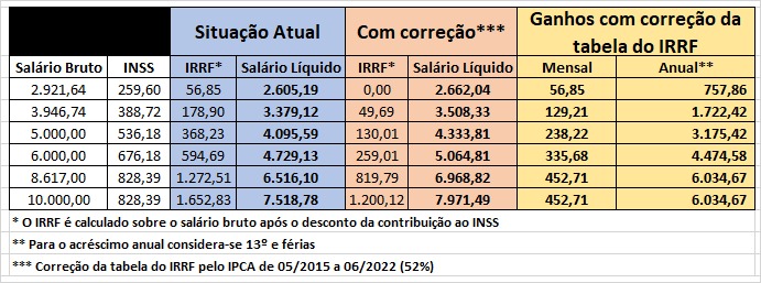 Cálculos do Dieese apontam que, por exemplo, quem tem salário bruto de R$ 5.000, caso a tabela tivesse sido corrigida pelo IPCA acumulado de 2015 até 2022, teria, no ano, R$ 3.175,42 a menos de tributação em seus salários (veja tabela com outras faixas salariais).