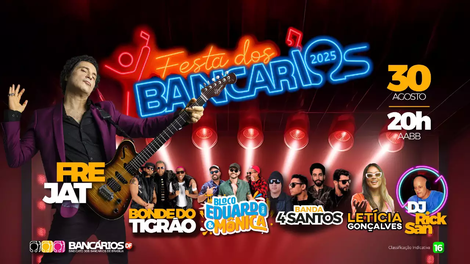 O evento, promovido pelo Sindicato em comemoração ao Dia dos Bancários, celebrado em 28 de agosto, começa às 20h e terá shows de Frejat, lenda do rock nacional e ex-vocalista do Barão Vermelho; do contagiante Bonde do Tigrão, referência do funk carioca; do irreverente Bloco Eduardo & Mônica, que mistura ritmos e sucessos para não deixar ninguém parado; do pop rock da Banda 4 Santos, além de Letícia Gonçalves, revelação do The Voice Brasil. A festa ainda contará com set especial do DJ Rick San, fechando a noite com muita animação.